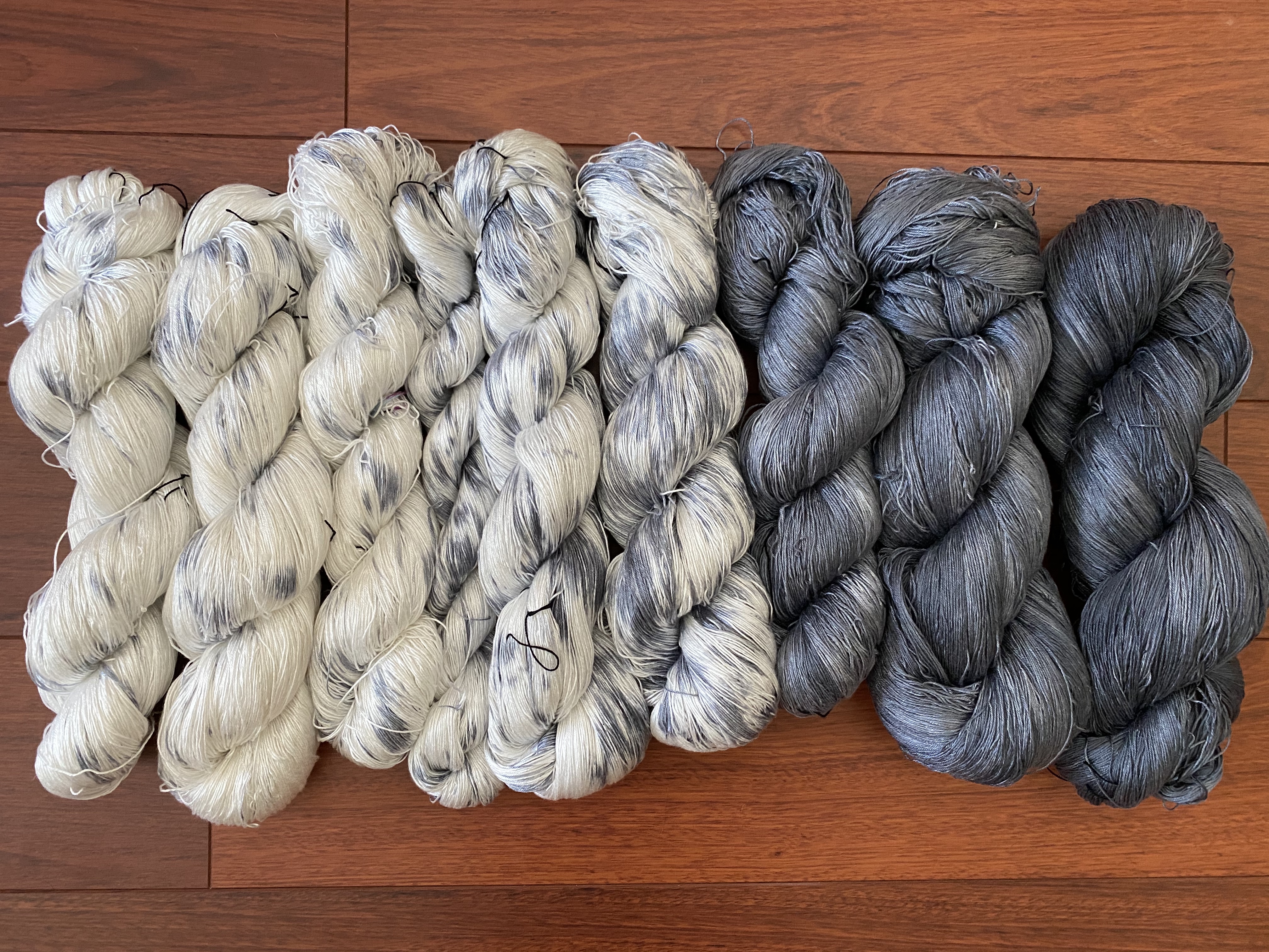 The color on this thick Tencel warp was inspired by a collage selected from a wide range of submisisons made during a group custom opportunity in the Localgal Handwovens Love Facebook group. The silver to white grad was dyed in skeins and blended during measuring. This warp offered both scarf and baby wrap widths. There are two baby wraps, two shawls, and several scarves from this warp.